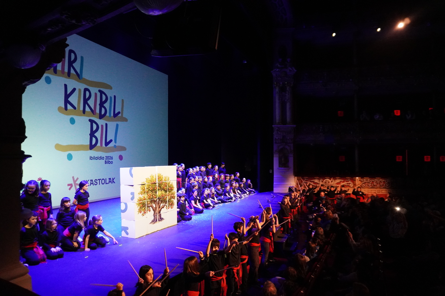 Jarraian, Kirikiño Ikastolako ia 100 umek "Aldapeko" abestia kantatu dute eta zuhaitz erraldoi bat eraiki dute oholtza gainean, arbolak fruituak eman dituela eta euskara Bilboko kaleetara zabaldu dela irudikatuz. Ikasle txikienak ere protagonista izan dira eta Ibilaldirako propio Ikastolan sortutako Kirikiñoaren ipuina kontatu dute, Ebaristo Bustintza “Kirikiño” maisuaren izena baitarama Ikastolak.